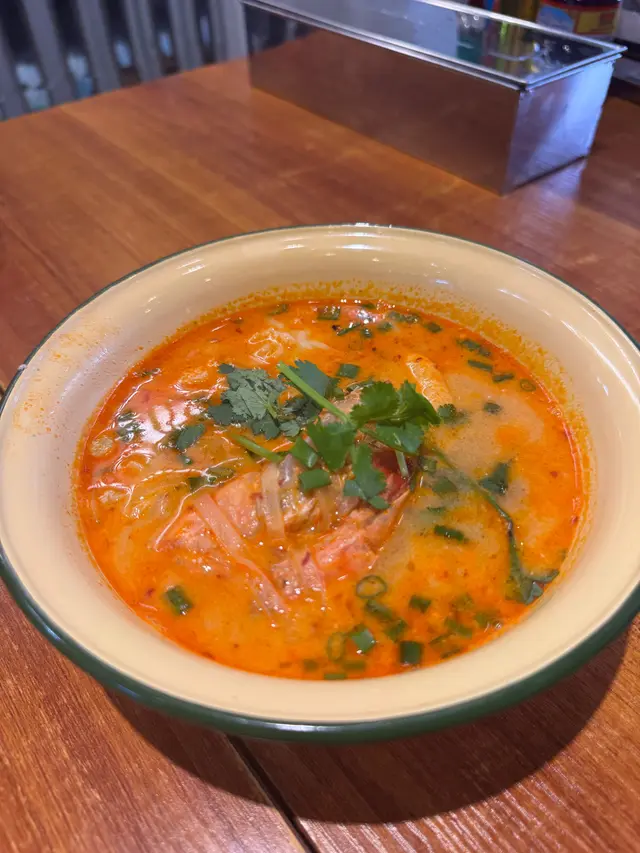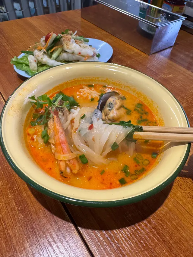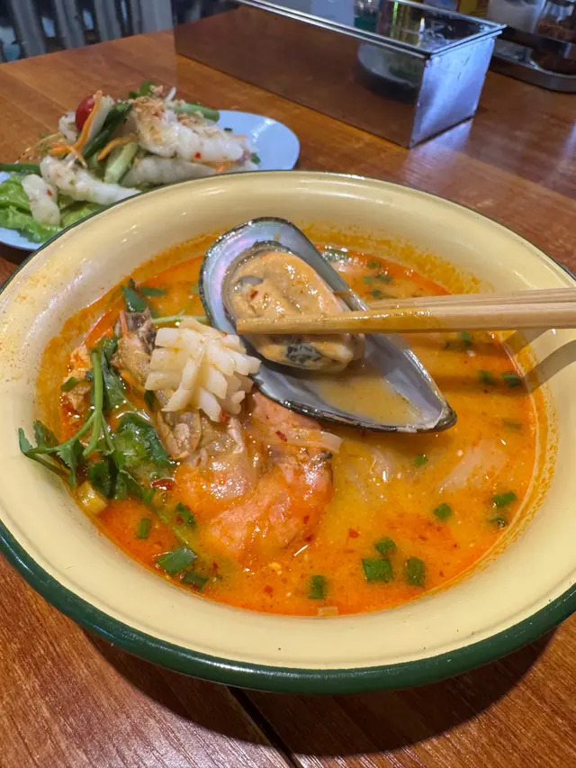 個冬陰功湯粉真係好似酒店自助餐整出黎咁,個海鮮味十足,有蝦,有青口,有墨魚,個粉口感軟滑,湯既辣度適中,味道好好,係份量唔算多🌶️🦑