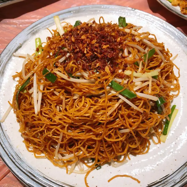 蟹油炒麵上面蘸上餐廳特調的炸蒜醬料,配上炒麵味道特別香,炒麵彈牙。