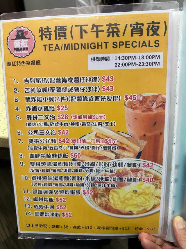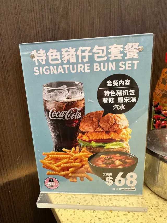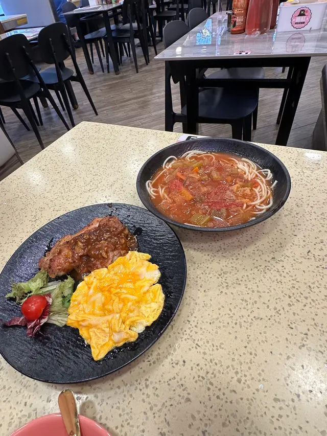 豬扒包有驚喜(與餐牌幅圖一樣),比其他餐廳少有的酸青瓜👍 都有蕃茄、芝士、好似有少量蛋、生菜,豬扒(略嫌細咗d)亦好香口,個包皮脆,仲有炸薯條,咁嘅價錢,冇得輸😊 另外,羅宋湯意粉,湯的分量都算多,可掛入意粉吃,香煎雞扒炒蛋,雞扒有香草味,好。檸檬茶及奶茶都算OK。