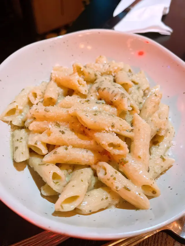 碟意粉真係超級creamy又香口, 醬汁色澤青綠得嚟又夠濃稠,啱啱好包裹住每條penne,仲有好多新鮮羅勒碎同芝士粉,一睇就知係用真材實料而唔係廉價野,意粉煮到al dente,有咬口之餘又吸滿晒醬汁,一野叉落去超滿足。