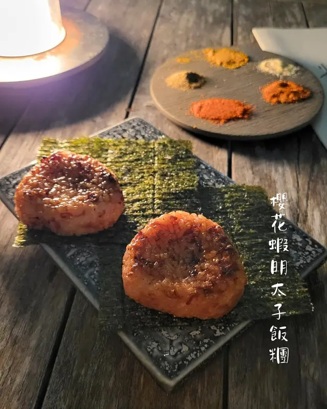 櫻花蝦明太子飯糰 ~ 外層燒到脆卜卜,裡面係鹹香嘅明太子,飽足感瞬間滿分。