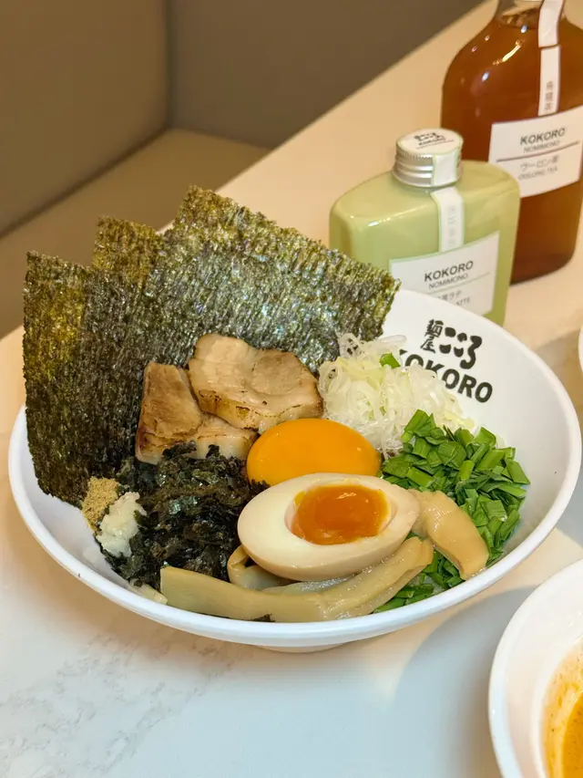 另外一碗招牌撈麵「正宗全料東京撈麵」有生蛋黃、辣肉碎、溏心蛋、紫菜、蔥花、竹筍⋯成碗麵材料好豐富。