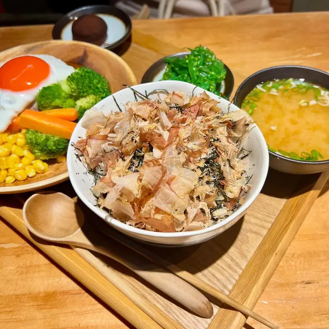 我升級左天井貓飯定食套餐,套餐有特色貓飯,味增湯,前菜同甜品。貓飯既做法係現實版《深夜食堂》的貓飯,用木魚片、海苔、鰹魚醬油同牛油拌飯。攪勻後香氣撲鼻!🍣 米飯粒粒分明,牛油香同鰹魚醬油嘅鮮味完美融合,木魚片同海苔提升日式風味,每一啖都好好食!