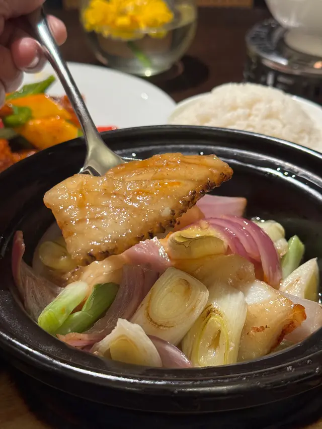 服務團隊推介,喜歡食魚絕不能錯過,一打開砂鍋香味四射,白鱈魚皮脆肉嫩好香滑,配上香蔥、紅洋蔥和大蔥等惹材料,配上一口白飯更加滋味