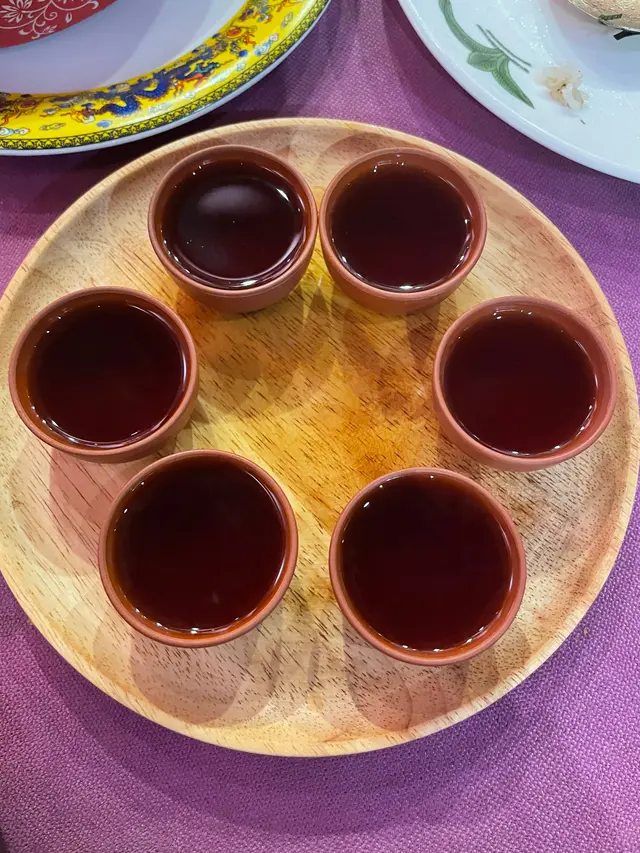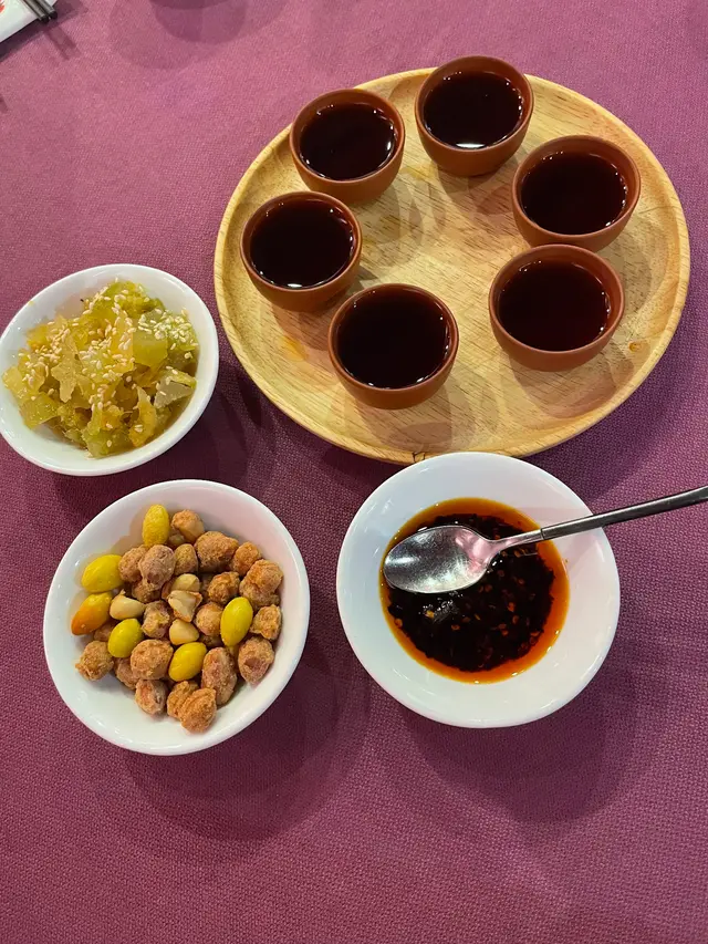 今晚訂咗食潮州私房菜。坐下時,店員便送上功夫茶、小食和辣椒油。
