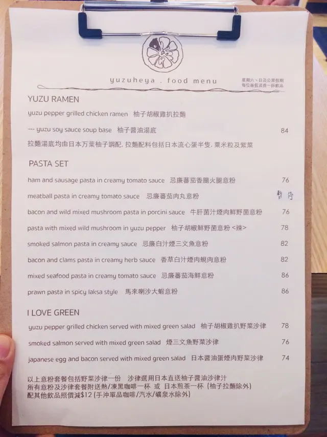 店內佈置得頗日系,主要用黃黃橙橙配襯白色裝潢,數張二人枱合攏,雖然不是很大,但一啲都唔侷促。我地隨便搵個位坐低就開始研究餐牌,非常貼心有中英對照,餐牌上分有沙律類、意粉類、拉麵類、飲品、同甜品類。