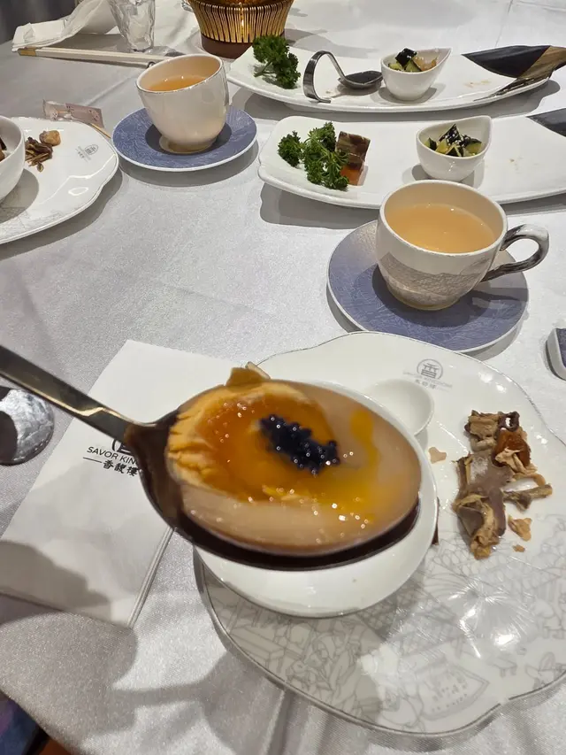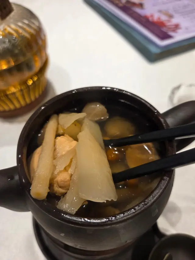 若說燒鵝是味蕾的狂歡,那燉湯便是身心療癒的良方。店家每日限量供應數款燉湯,如「海底椰川貝燉鷓鴣」或「蟲草花燉雞湯」,湯色清澈見底,入口卻濃郁