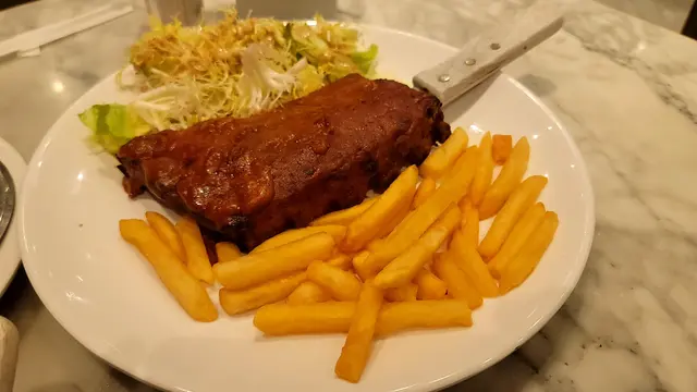 呢個晚餐跟埋羅宋湯同蒜茸包,仲有嘢飲,真係抵食!豬仔骨好大條,啲肉又嫩又入味,BBQ醬汁甜甜哋,好惹味👍,薯菜就正常水準啦。
