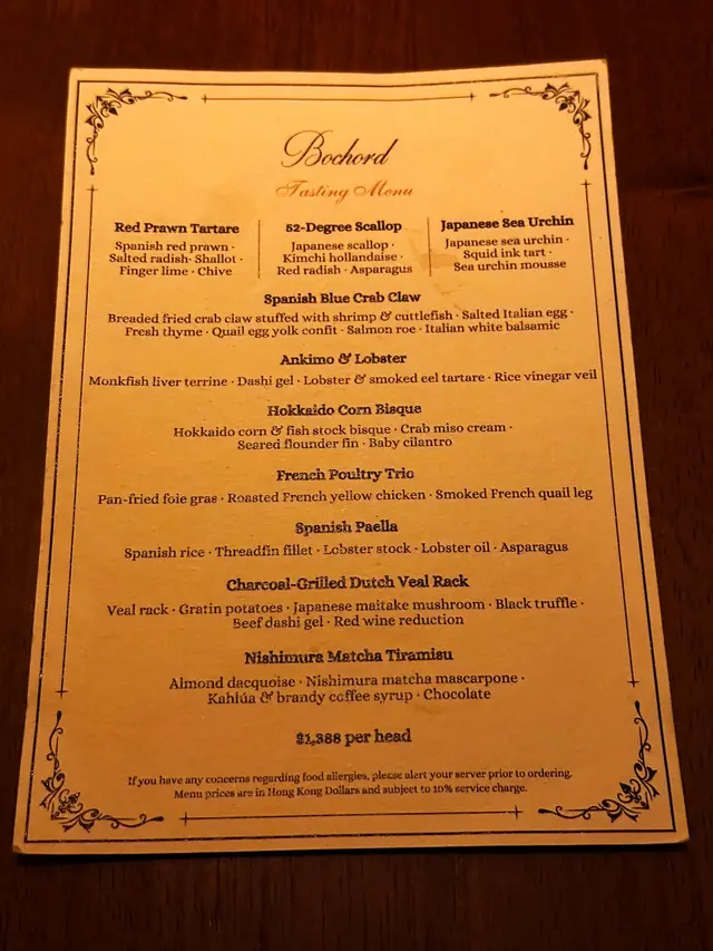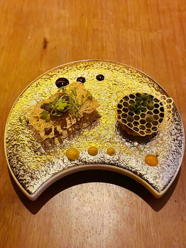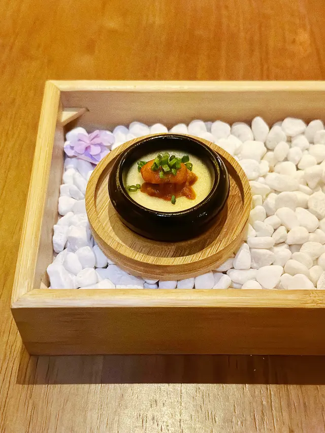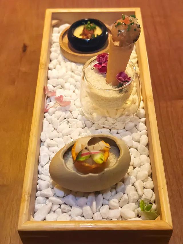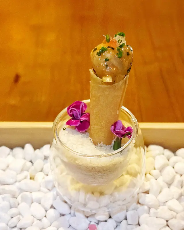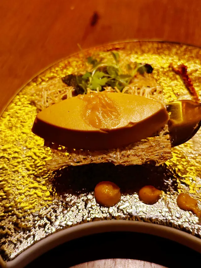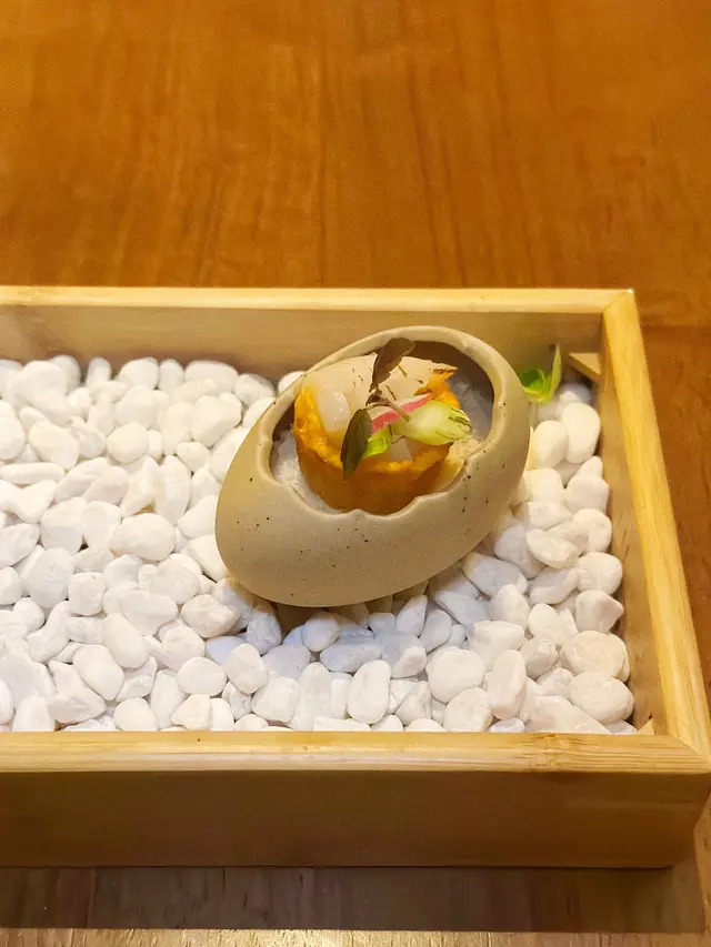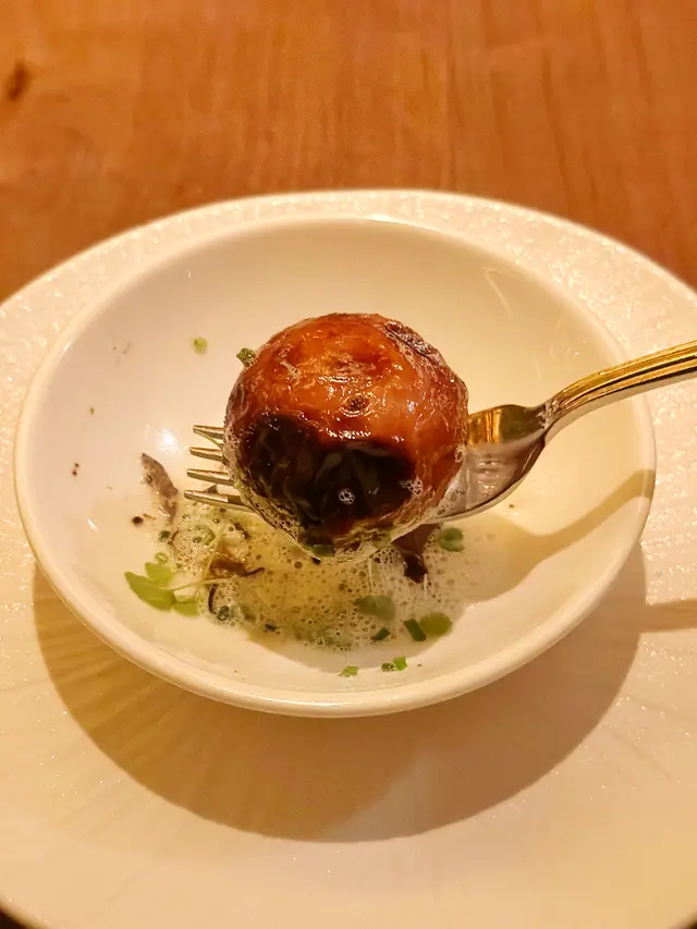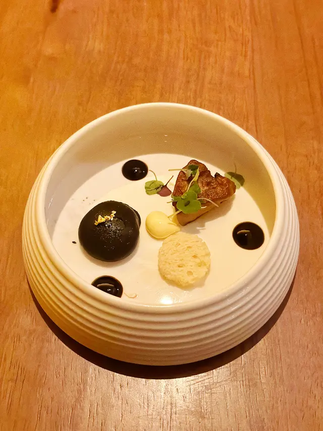 Red Prawn Tartare & 52-Degree Scallop & Japanese Sea Urchin : 賣相精緻嘅頭盤,有紅蝦肉他他脆筒,半熟帶子撻及海膽慕絲撻,當中海膽慕絲撻嘅撻皮非常特別,係用墨魚汁做成,口感軟彈,非常有驚喜