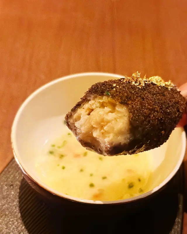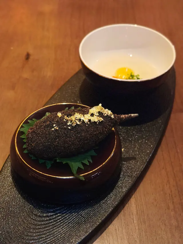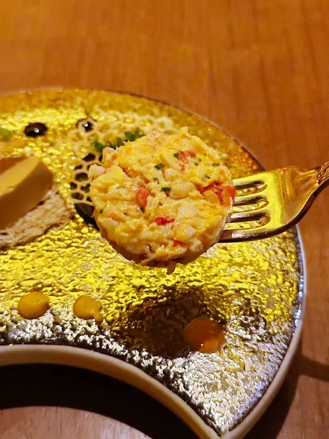 Spanish Blue Crab Claw : 用上西班牙藍蟹鉗加入墨魚等餡料混合,麵包糠炸至口感酥脆,再蘸上由鵪鶉蛋,三文魚籽及白葡萄汁撈混嘅醬汁,味道更加豐富,食落無咁熱氣