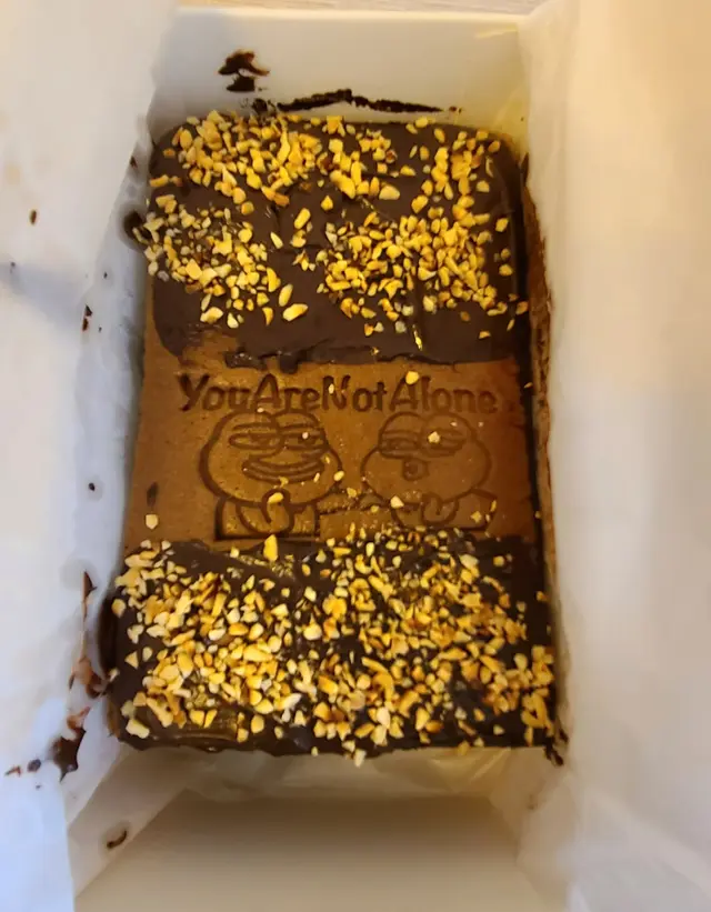 焙茶同朱古力味好夾,中層更填滿厚厚朱古力醬,依款就鋪上金沙面(朱古力醬、果仁碎),看見已口水直流了!