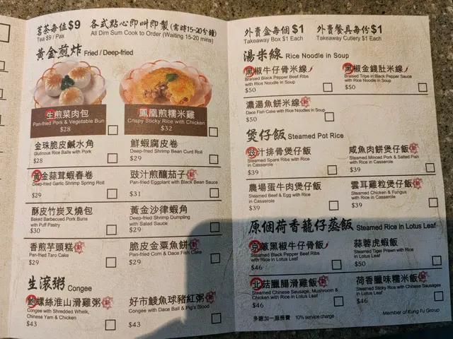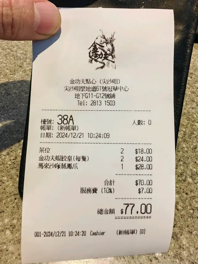 正常水平/顺路可以吃/专程来没必要 bettetle等级42024-12-21523 views Follow 周末早上遛弯到附近,觉得应该坐下休息一下的时候,查到有这么一家店,友军评论不是很正面,不过实在不想找其他店了,就壮着胆子进来一试吧两人两杯茶,两个茶点,分别是金功夫虾饺皇两个及马来沙嗲蒸凤爪。虾饺皇发挥正常,虾很实在,皮的口感一般。马来沙嗲蒸凤爪有点辣口,不过味道都行,茶选了白牡丹,不知道是不耐泡还是是旧茶,一壶喝完第二壶就非常寡淡了,不过因为是吃过早饭来歇脚喝茶的,也就没让换茶。周内11.30前有八折的早茶优惠,假日某有。116916The above review is the personal opinion of a user which does not represent OpenRice's point of view.LikeShare正常水平/顺路可以吃/专程来没必要 金功夫點心 https://s.openrice.com/QrLT0Izii00Report Post Ratings3Taste3Decor3Service3Hygiene3ValueDate of Visit2024-12-21Dining Method堂食Spending Per Head$39 (早餐)