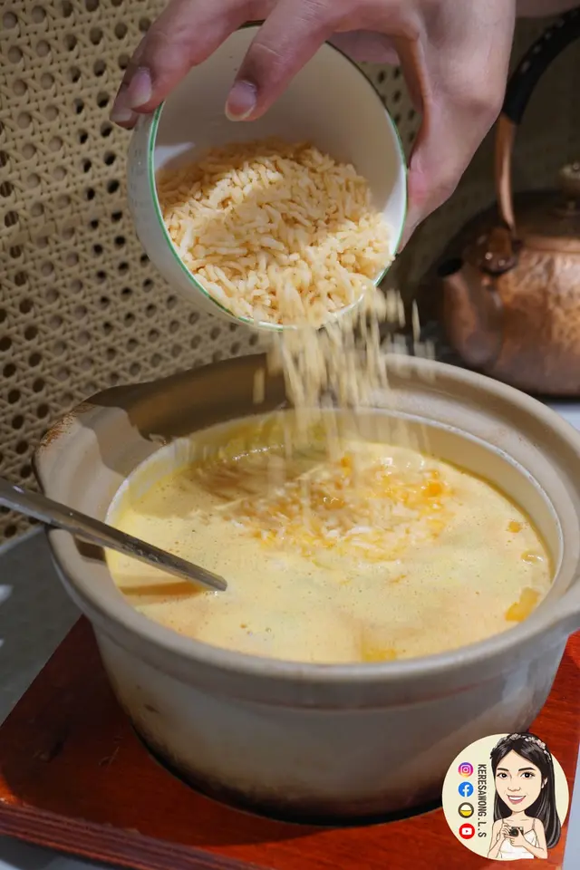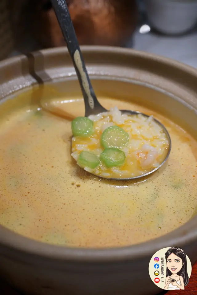 泡飯熱辣辣上檯, 米飯已加入湯底中浸泡著, 盡吸湯汁, 蝦粒份量偏少, 但湯汁極為鮮甜, 食之前自行加入脆米, 增加了口感層次。
