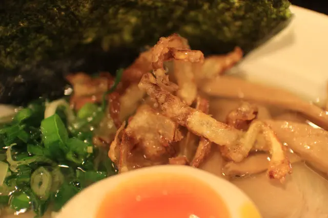 我的「濃厚鹽叉燒拉麵」比太座的「極上味噌拉麵」多了三塊叉燒,共有四塊之多 。這兒的叉燒做得不錯,厚薄適中,肥瘦比例也見合適,吃來口感頗佳 溏心蛋也不錯,流心和有蛋味與蛋香 。最特別的配料則是炸洋蔥,既香口,也能吸湯,比一般的拉麵配料來得有特色