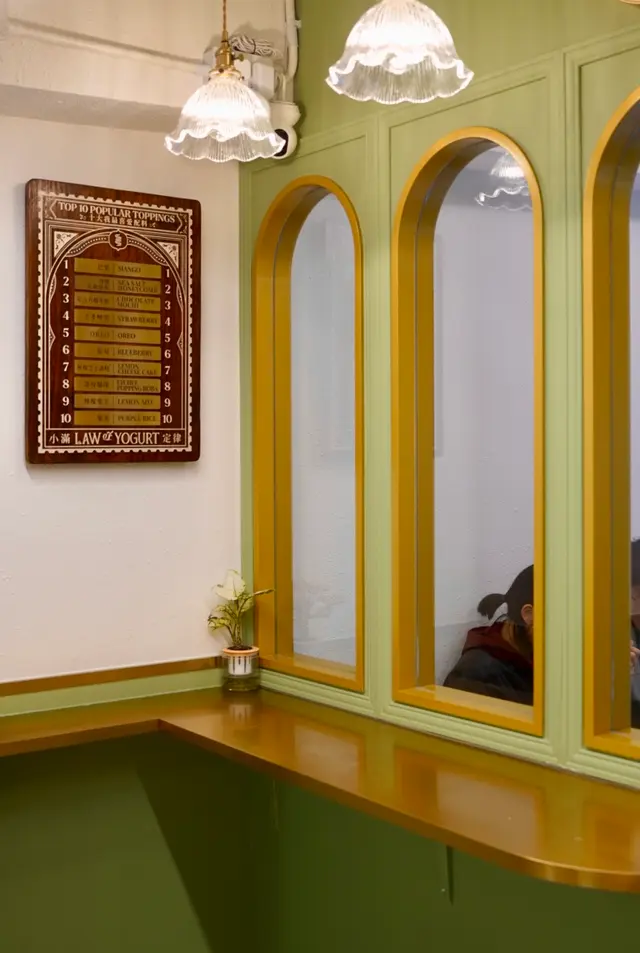 小满定律是西贡小有名气的酸奶冰淇淋店,二店开在长期排队的巴斯克芝士蛋糕hemma斜对面,清新自然的牛油果色店面