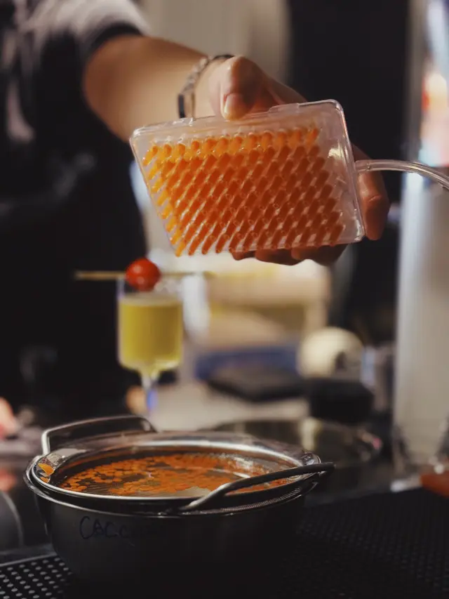 呢杯用Bloody Mary 做概念既雞尾酒可以自己將番茄液體整成一粒粒魚子醬既份子料理, 再加入酸甜既雞尾酒, 配埋用Tabasco去醃製再打入C2O 既車厘茄一齊食, 辣辣地幾過癮🤘🏾