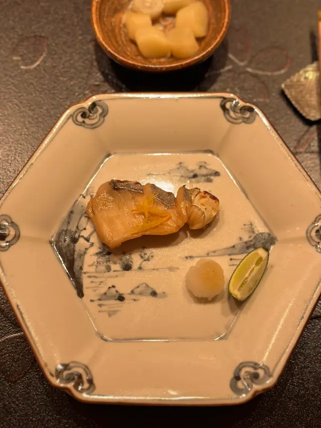 鰆魚幽庵燒源自江湖時代發明,鰆魚肉質鮮嫩,油脂肥厚,加入檸檬絲散發清爽香味。