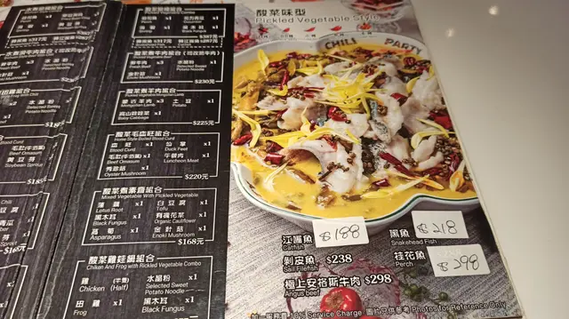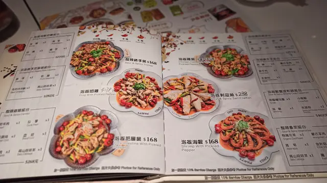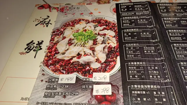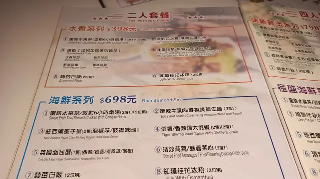 餐牌琳琅滿目,無論是此店招牌水煮或乾鍋的食物一應俱備,各式其色;其後留意到餐牌上有一套餐,由燉湯到小食到主菜連甜品,一應俱全,而且價錢相宜,與好友都一致贊成點這個套餐;
