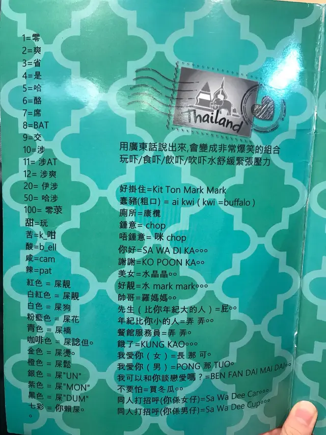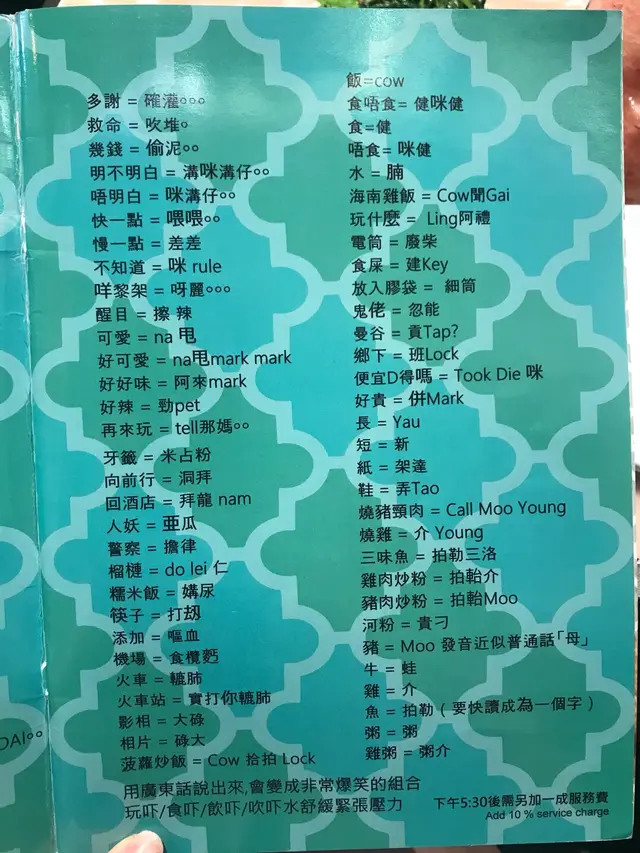 打開餐牌頭兩頁就是廣東話泰文教學,非常抵死搞笑