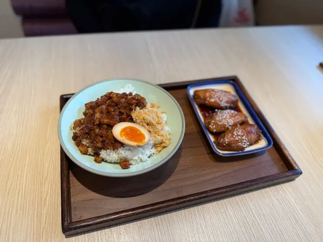 滷肉飯份量都唔少,上面淋上大量滷肉,仲有肉鬆同溏心蛋,口感好豐富。黑麻油雞翅好入味,肉質嫩滑帶有黑麻油香氣!