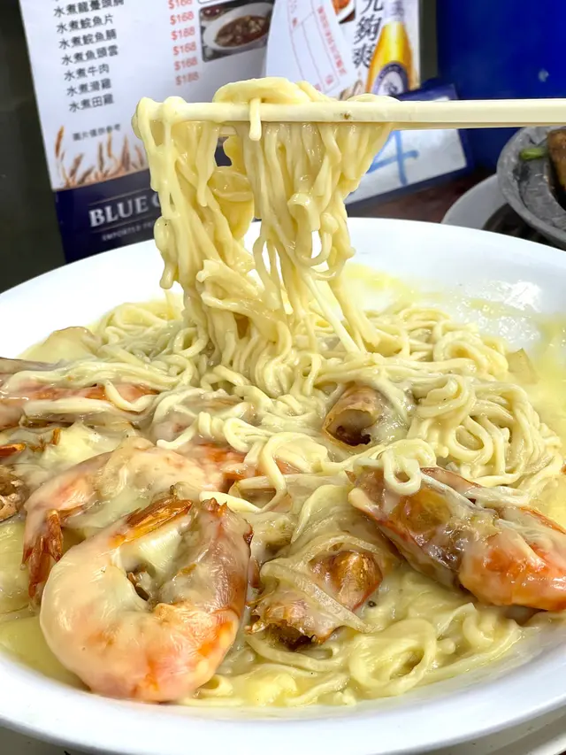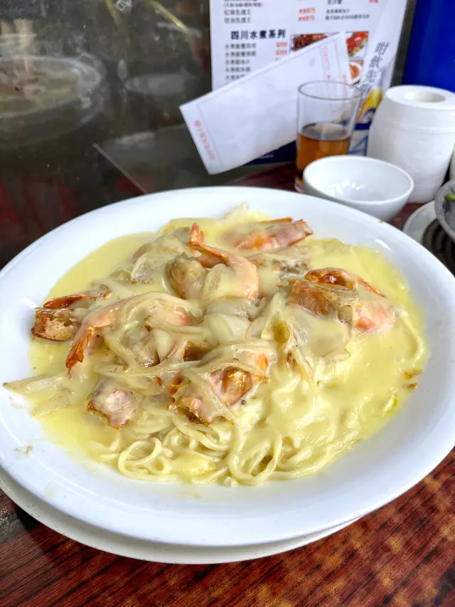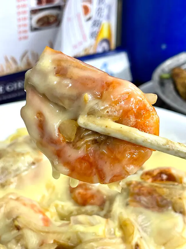 芝士焗生中蝦伊麵:海蝦的鮮甜、芝士的濃香以及伊麵的柔軟相互融合,香滑順口,層次豐富且帶有溫潤奶香,非常適合喜歡芝士與鮮蝦結合的食客享用。