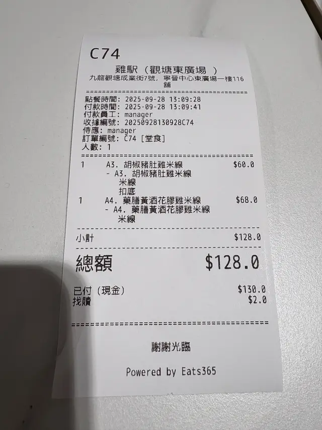 今次選了雞駅食胡椒豬肚雞米線(60)和藥膳黃酒花膠雞米線(68)