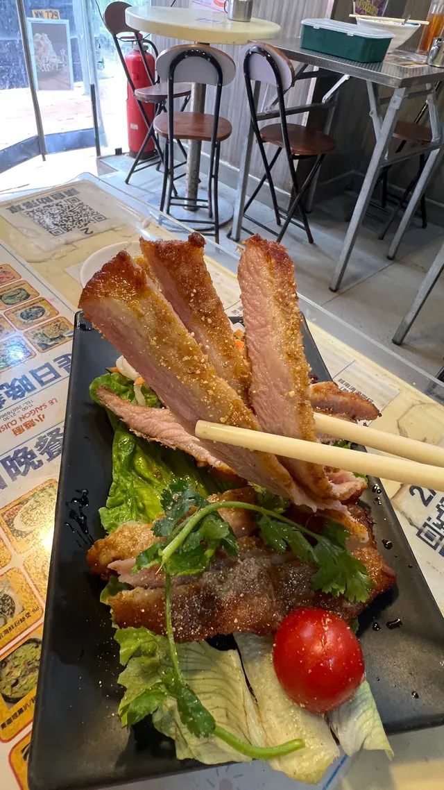 真係原塊燒豬頸肉勁大塊份量,燒到面頭好香亦落咗好多醃粉令到更加入味,再配埋越式酸汁更加開胃