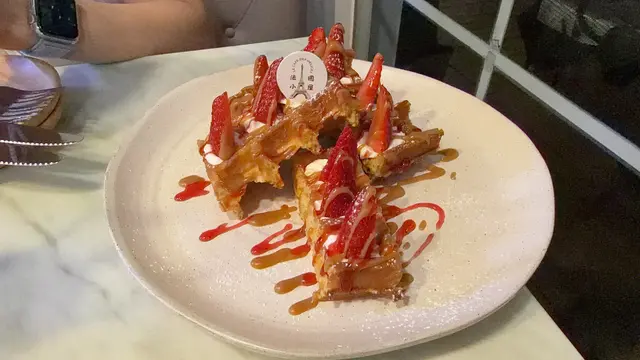 上桌時便被其顏值驚艷,金黃酥脆的窩夫上,鮮紅的草莓如寶石般點綴,淋上的焦糖醬與草莓醬交織出誘人的色澤。入口時,窩夫的酥脆與草莓的清甜、焦糖的醇厚完美融合,奶油的絲滑更是為這份甜蜜錦上添花,每一口都是法式甜品的浪漫與精緻,是結束餐食的甜蜜收尾。