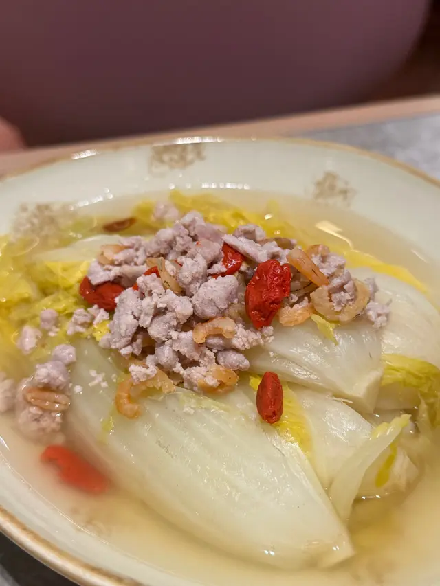 蝦米+豬肉末爆香,上湯一淋,娃娃菜瞬間變軟糯!湯底鮮到發光,一夾菜梗「喀啦」菜葉滑嫩,清爽又下飯!