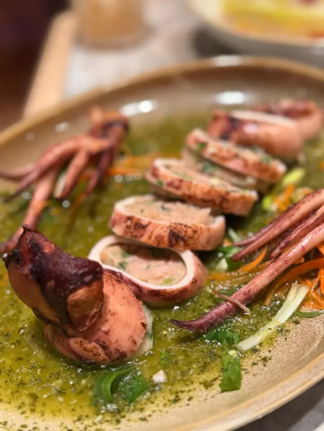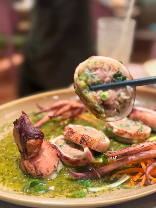 整隻大魷魚釀糯米+豬肉+冬菇,淋香茅青檸汁清蒸!魷魚Q彈吸滿酸香,一切開糯米飯香撲鼻,海鮮版釀鯪魚進化版!