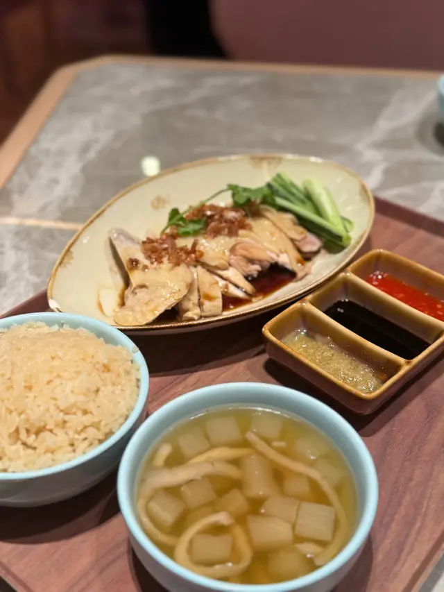 滑雞去骨切件,雞皮金黃閃油光!香米用雞油炒過再蒸,粒粒油亮,三醬(薑蓉、辣椒、黑醬油)齊上,一碗KO午餐!清雞湯暖心到想哭。