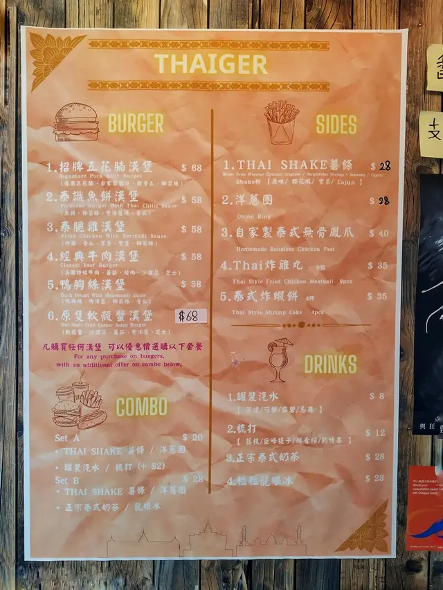 叫得自己做泰式,間鋪真係有得叫以泰式炸雞或者魚餅整成o既burger,而小食都有無骨鳳爪同蝦餅揀wo。我試o左一個原隻軟殼蟹漢堡($68),賣相唔錯,隻蟹突晒出o黎大件夾盛惠,食落又十分鹹香鬆脆。