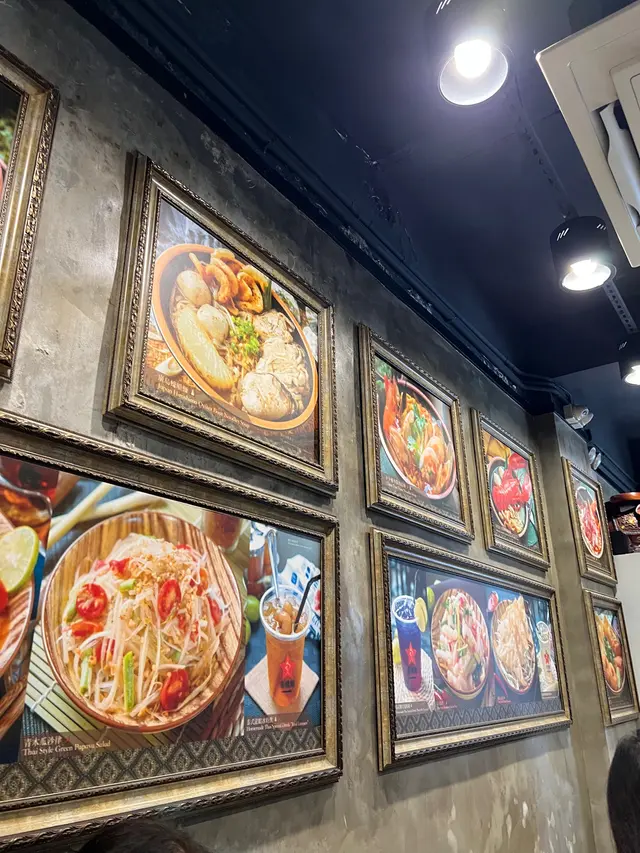 牆上掛滿色彩繽紛嘅食物相框,背景仲播住熟悉嘅泰國音樂🎶 滿滿泰國氣息