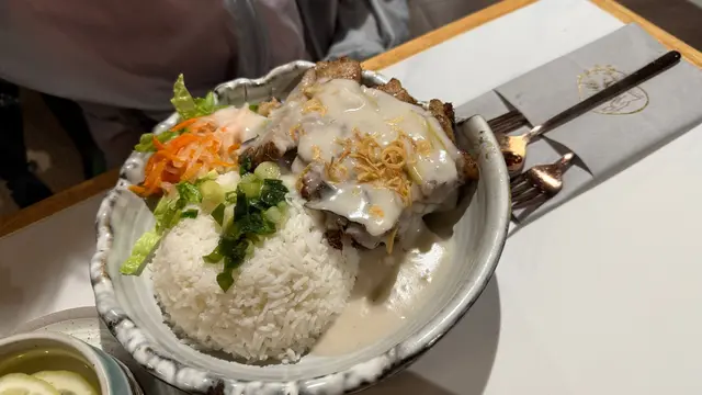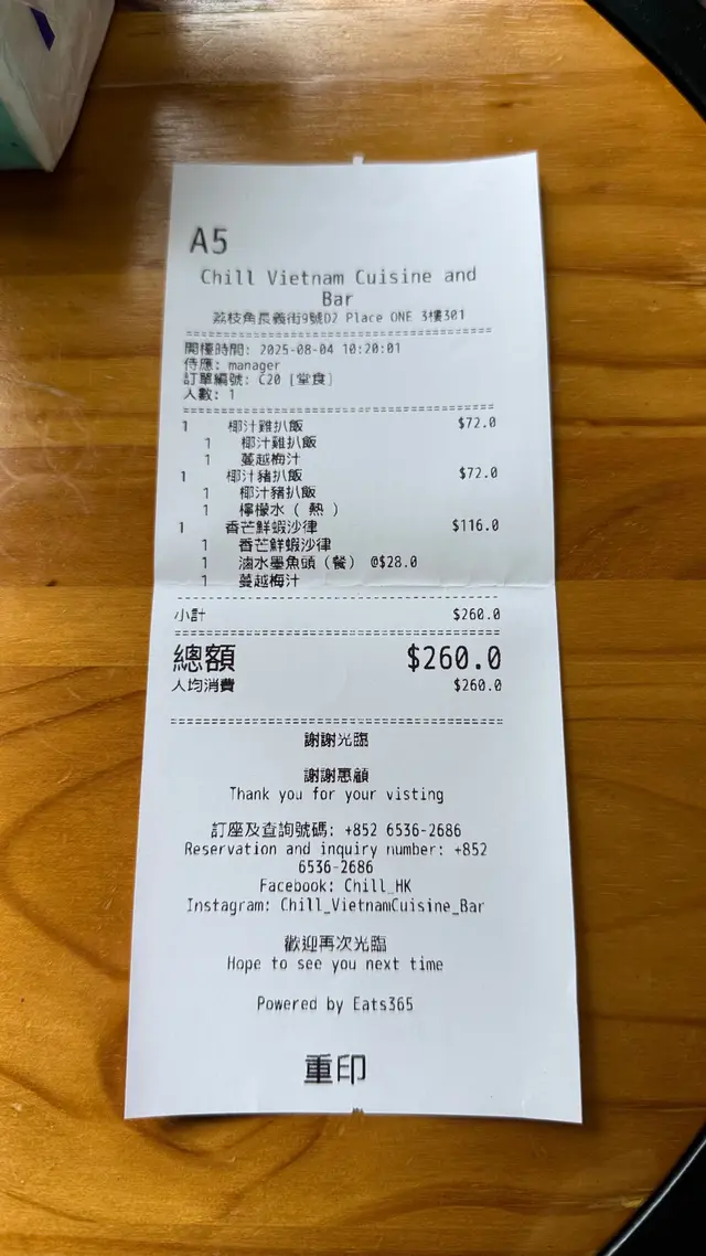 活化工廈中的越南菜 caroppy等级42025-08-05981 浏览 关注 荔枝角區平日嘅午市時間,唔預早訂位會有啲擔心,更何況帶住兩老。見到呢間越菜幾抵食,一於訂位帶兩老試吓,枱面餐具用熨金餐紙包住,熨金特別又吸晴。熱檸檬水用竹枝拮住三片檸檬,好有越式感,蔓越苺汁同飲利賓納無差別~兩者好似。兩老食嘅椰汁豬扒同椰汁雞扒飯擺盤一樣,份量大大份,濃濃椰汁味唔合我心意。1香芒鮮蝦沙律,5大隻爽口彈牙嘅蝦配沙律菜同微酸汁,好清爽。滷水墨魚頭,原來似街頭小食加醬嗰種,但口感淋淋,如果係爽口會比較加分。唯一不滿的,埋單時唔問店員都唔講我原來1點13分入座,到達時都唔提醒一下,搞到無咗個折扣。142以上食记乃用户个人意见 , 并不代表OpenRice之观点。1分享活化工廈中的越南菜 Chill Vietnam Cuisine and Bar https://s.openrice.com/QrLT0aiykW0检举 张贴 评分4味道3环境4服务4卫生5抵食用餐日期2025-08-04用餐途径堂食人均消费$87 (午餐)