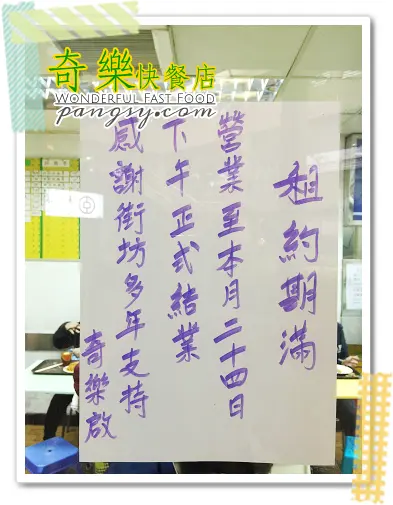 從網上媒體得知位於大圍新翠邨的老牌港式快餐店《奇樂》因租約期滿,而將於本月底結業。