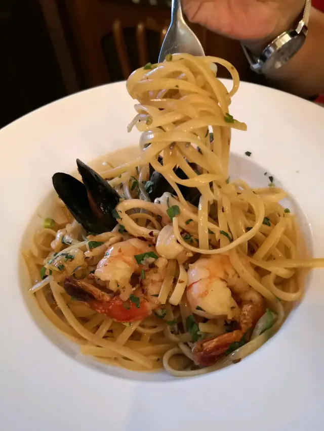 另一道主菜是香辣海鮮扁意粉。海鮮有鮮味藍青口,爽口魷魚,還有既新鮮、又大又彈牙的蝦,加上辣道更美味。