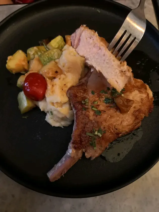 黑毛豬的味道甘香,肉質比想像中軟。因為豬扒是很難煮得不結實的,所以店家採用了慢煮的方式,就算肉厚也能全熟不結實。切下去是順刀的,代表肉質還是軟身。