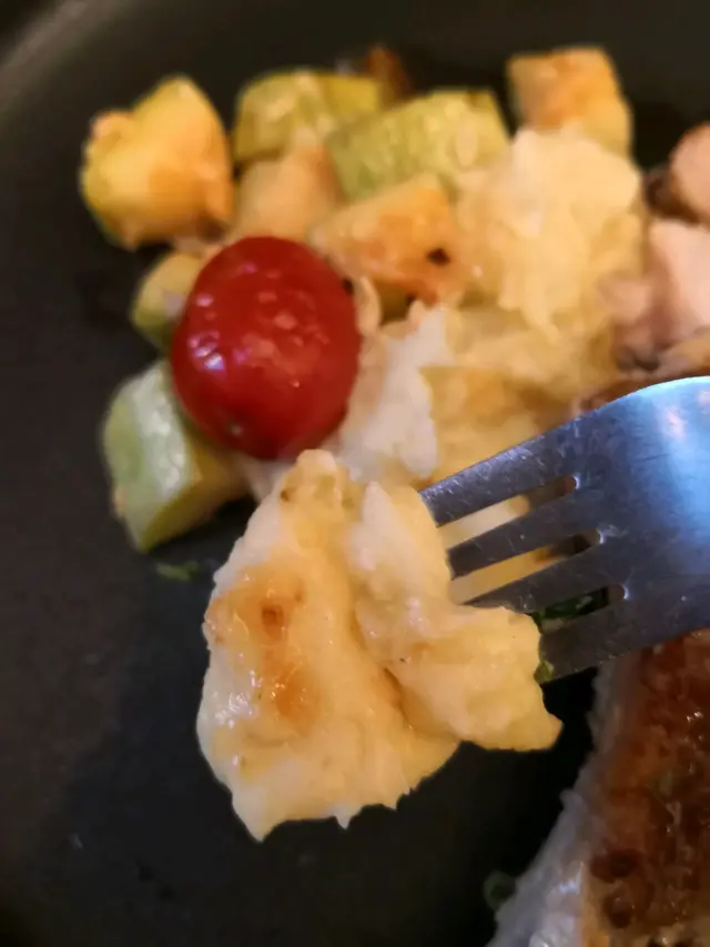 配菜也很有驚喜,翠玉瓜粒多汁又新鮮,那個薯蓉更是一絕。薯蓉幼滑又creamy,內裡還有粒粒軟身的薯肉吃,口感一流。