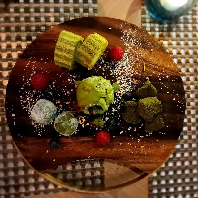 一個組合盤,包含了抹茶雪糕、蛋捲、福餅和麻糬,紅莓藍莓。
