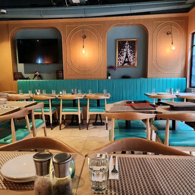入到去都係tiffany blue顏色嘅皮梳化、皮椅、配木枱