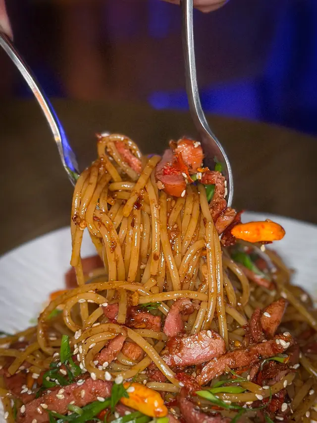 以油封鴨絲作主軸,加入辣油香炒嘅意粉,辣得過癮!