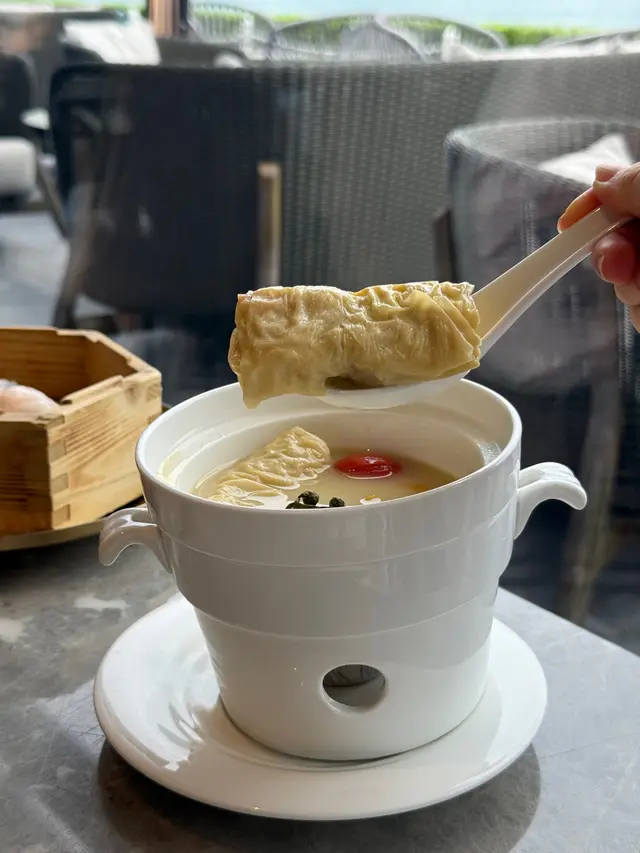 湯底清澈鮮甜不油膩,充滿竹絲雞嘅滋補味道,花膠大件爽口,整體好足料。
