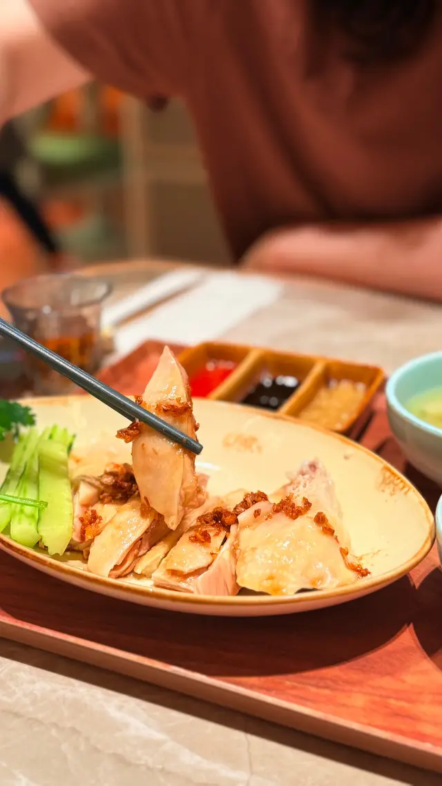 雞肉滑嫩,皮夠薄,仍見到透白膠原貼住雞肉,飯香得嚟分明,淡淡「雞油」味,配埋特製姜蓉同辣椒醬,簡直係完美嘅經典組合!
