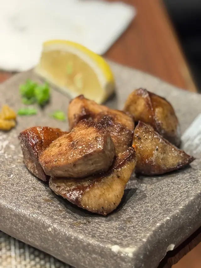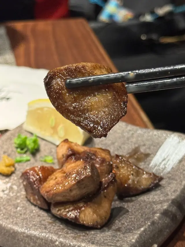 牛舌芯切為標準厚片,表面炙烤痕跡分明,略帶焦香,色澤呈現粉紅至淺褐的漸變,肉汁鎖存得當。鹽燒調味僅用簡單岩鹽,突顯原料本味。