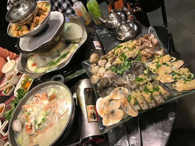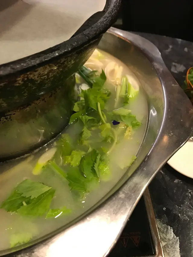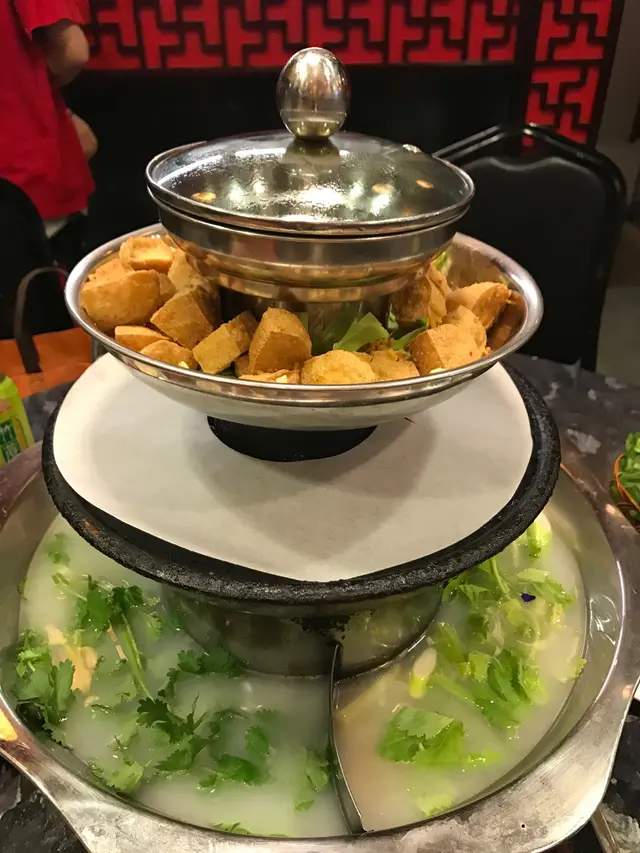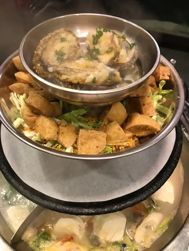 到第二層係炸豆腐,香脆。第三層係熱板,我地額外叫了一碟手切牛頸脊$198,可煎又可放湯打邊爐,煎香牛味濃香啲,放湯淋啲,火煱湯底,叫了芫茜皮蛋同蕃茄薯仔湯,將海鮮盤的龍躉肉放落湯底,幾分鐘撈起,好彈牙,肉質結實,連花螺都放湯煮,爽口; 之後再蒸聖子,青口,大蜆,蚌仔,全部都好新鮮,簡單放上蒜蓉調味已好好味。