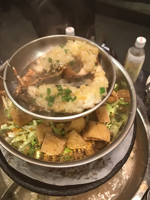 再叫埋龍蝦龍躉四人餐$388,好超值,先煮新鮮活鮑魚,好生猛,郁吓郁吓。再上特色四層鍋,頂層可一次過放了三隻鮑魚,仲剩一隻等下轉。店員稱蒸7分鐘,面放了蒜蓉,咬下超彈牙,好肥美,鮮味十足。