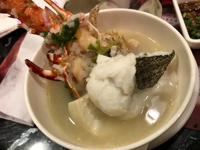上粥喇,見到好大隻龍蝦,切左約十件,好多肉,彈牙。而大蜆都有好多隻,食極都有,初初覺得啲粥既米好少,點知原來越煲越綿,啲粥仲越清甜,吸晒龍蝦同蜆既精華。
