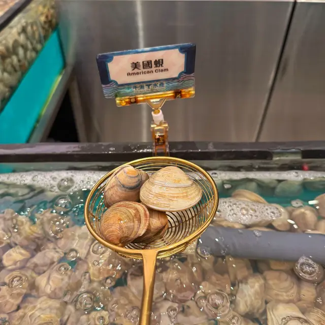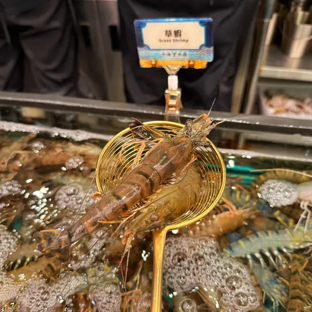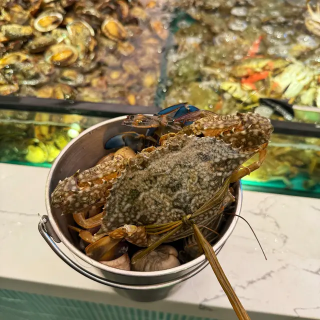 即撈活海鮮區絕對係全場焦點😍,成個小型海鮮市場咁,擺滿生猛海鮮✨。最開心就係可以一齊撈海鮮,蝦蟹上枱時仲生猛到彈起🦐🦀,職員會勤力撈走狀態唔好嘅海產,保證新鮮。而且不停補貨,任撈任煮,海鮮迷必到!