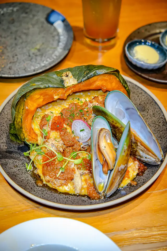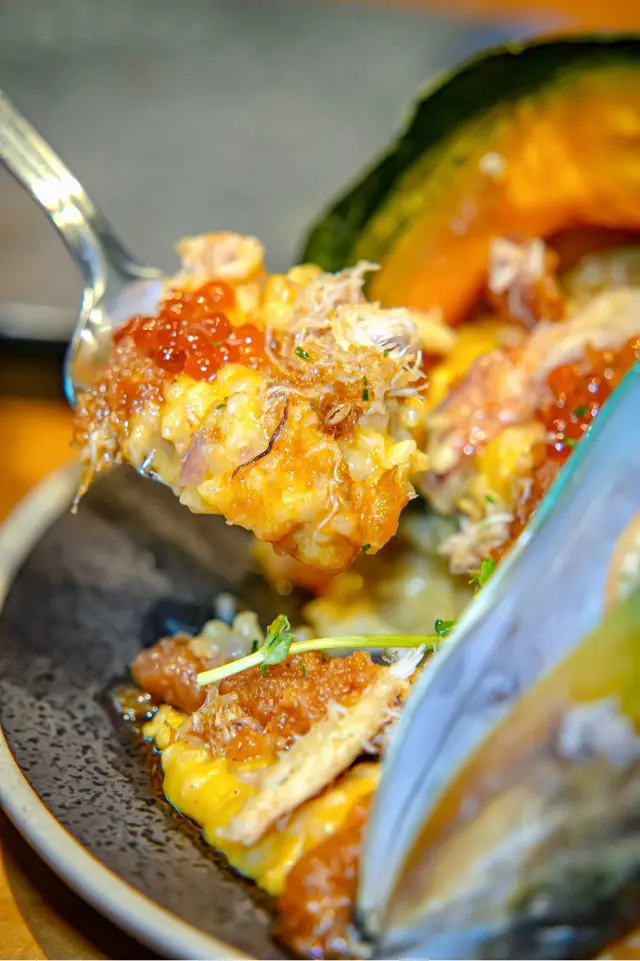 承載住用蟹肉、明太子、三文魚子、鹹蛋黃、南瓜蓉同忌廉煮成嘅意大利飯,就咁食個飯有啲鹹膩,就咁食焗南瓜會有啲飽滯,但將兩隻撈勻一齊食就達到Harmony嘅口感同滋味🤩;