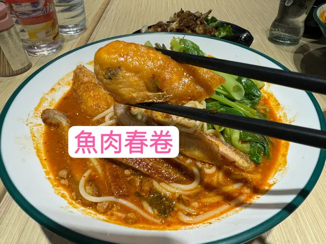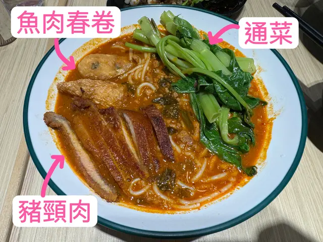 我嗰碗係小辣,有豬頸肉、魚肉春卷、通菜。
